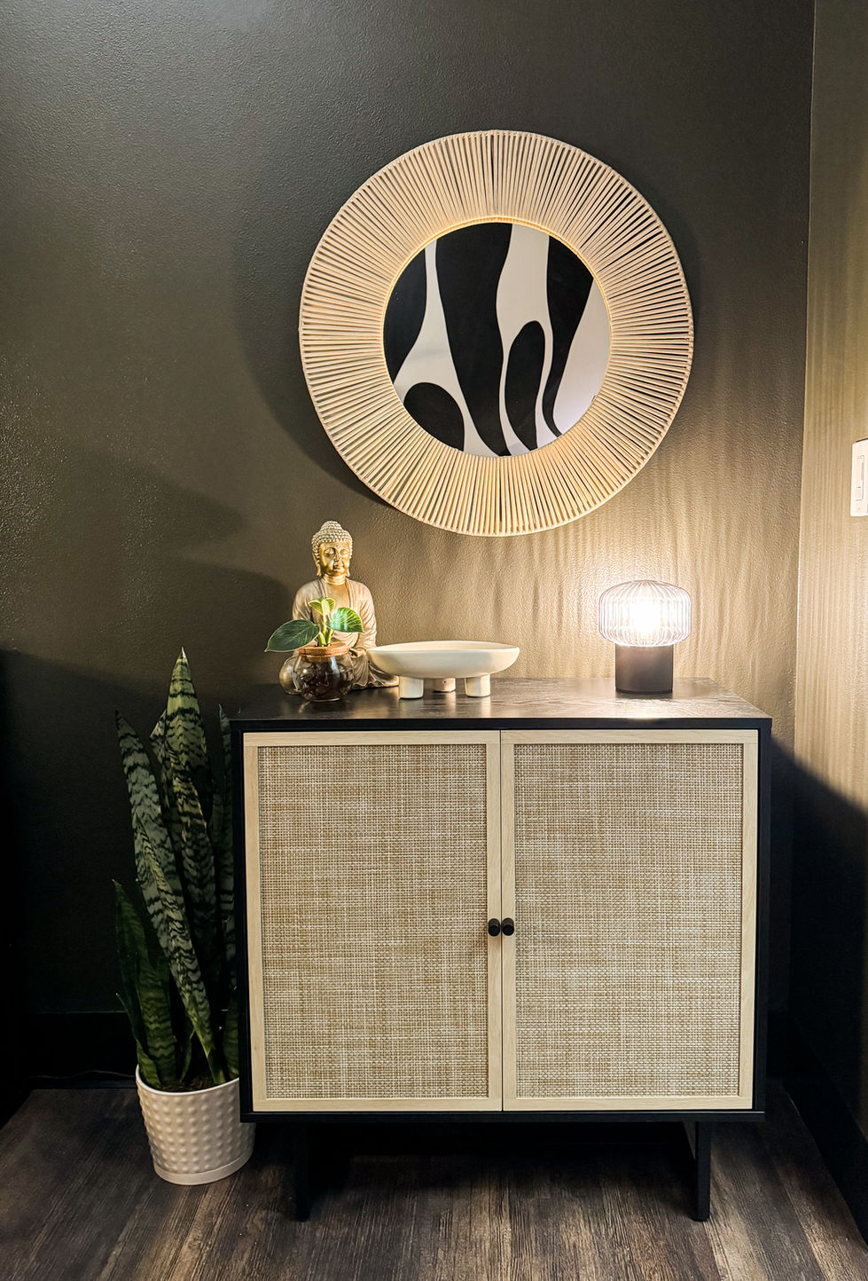 This project offered an opportunity to create a stunning space and an experience for this business owner's clients. Leaning into the small size of the space was key, as smaller spaces have the superpower to be cozy and intimate. Moody walls, warm lighting, organic elements and a gorgeous wall mural was the perfect recipe for cozy to meet fun!
